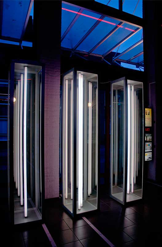 1974, sculpture: 3 lightstelae, each 280 x 40 x 40 cm, aluminium, light tubes, transparent mirror